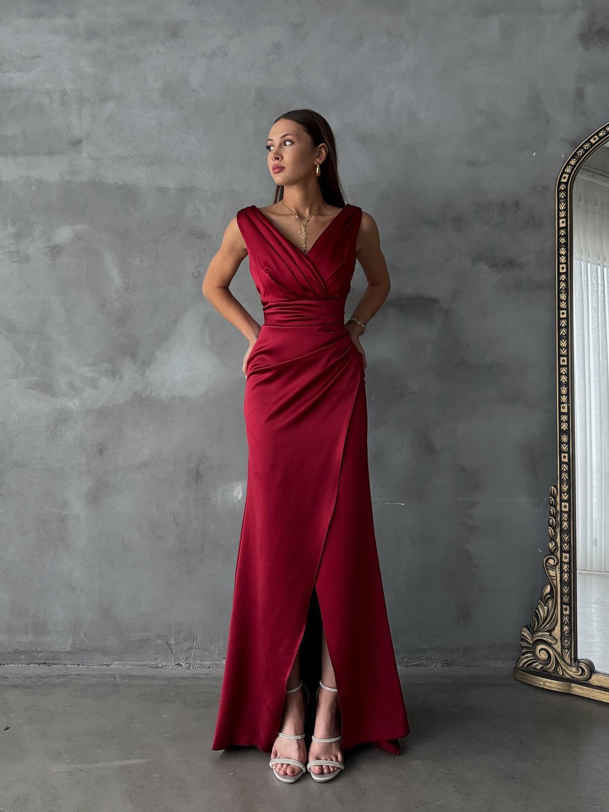 Avelaya V Yaka Drapeli Bordo Saten Uzun Abiye