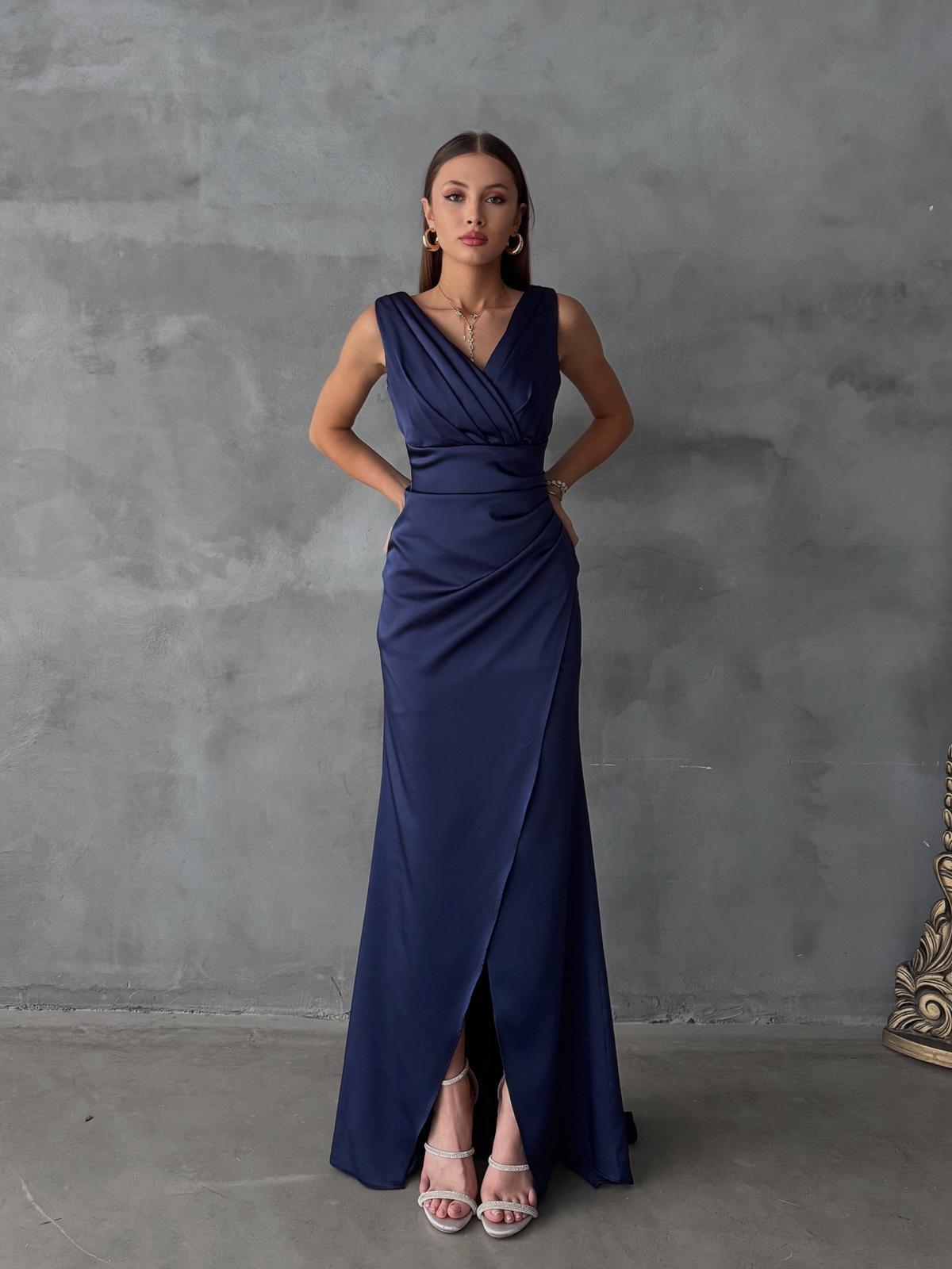 Avelaya V Yaka Drapeli Lacivert Saten Uzun Abiye