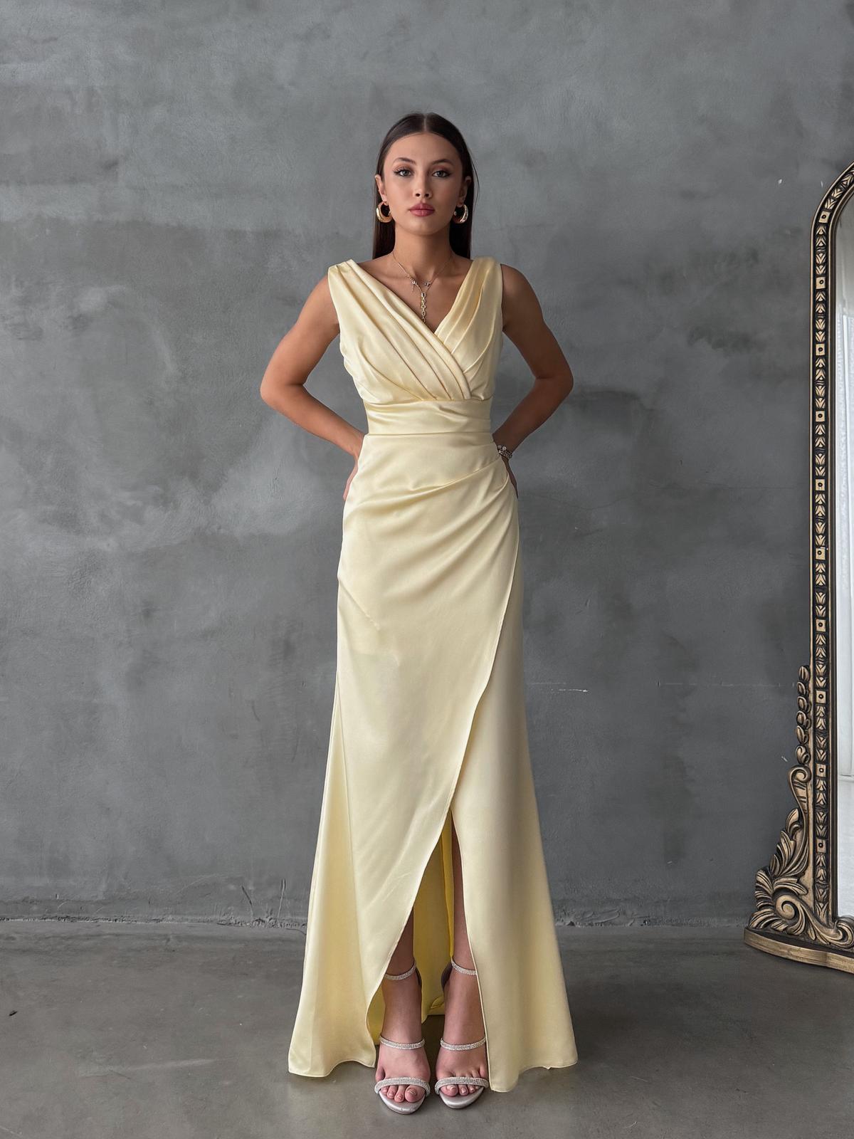Avelaya V Yaka Drapeli Sarı Saten Uzun Abiye