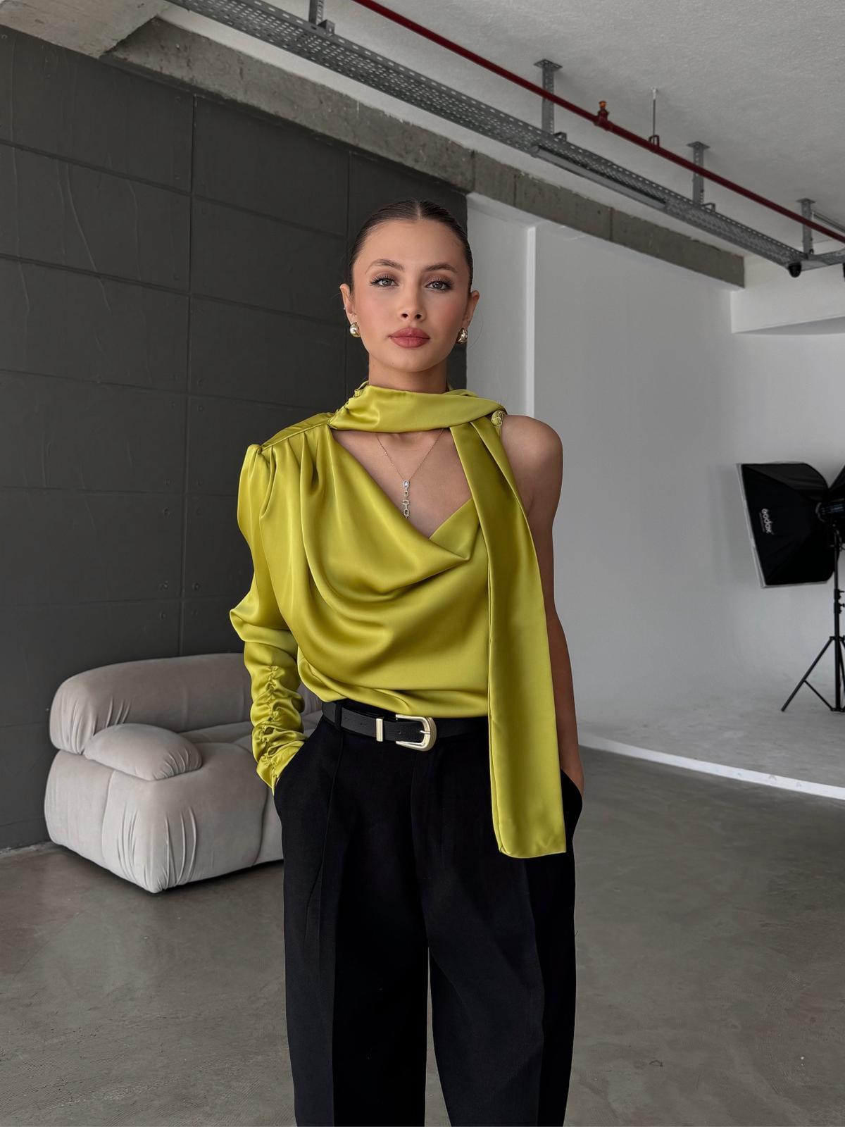 Calreth Tek Omuz Detay Fıstık Yeşili Saten Bluz