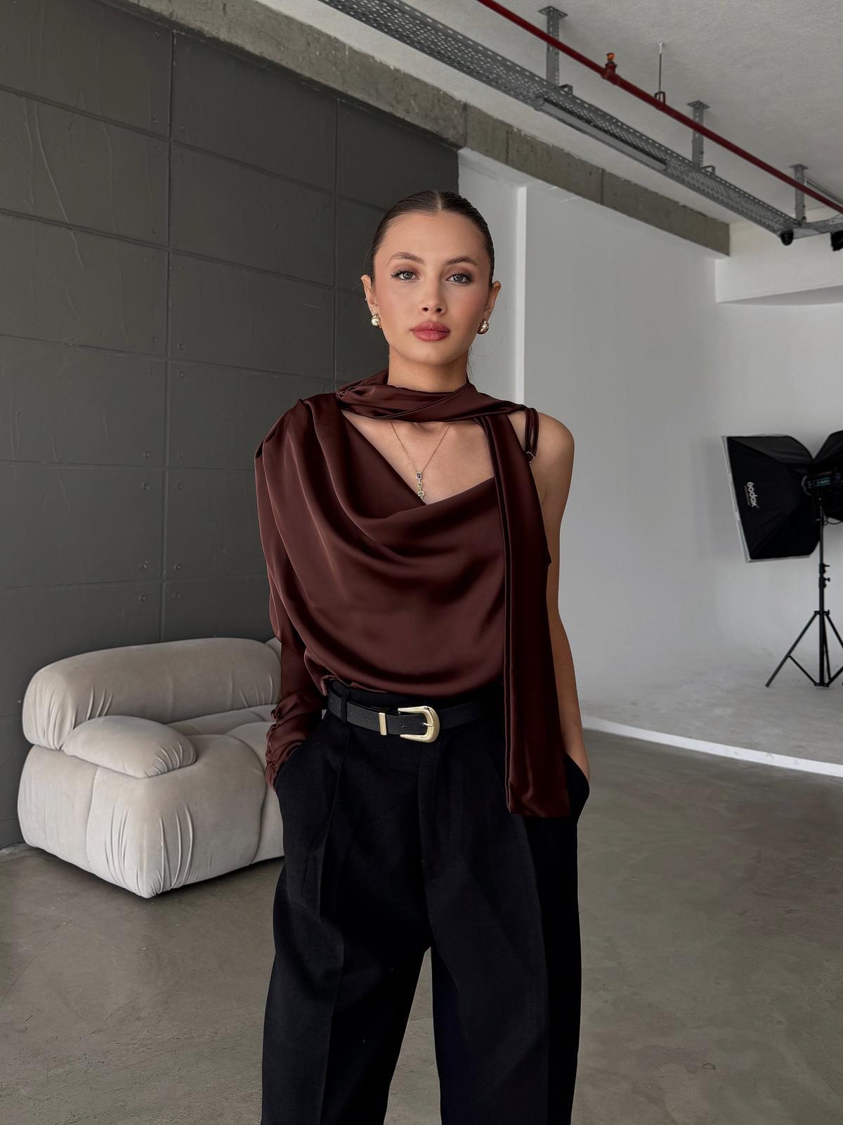 Calreth Tek Omuz Detay Kahve Saten Bluz