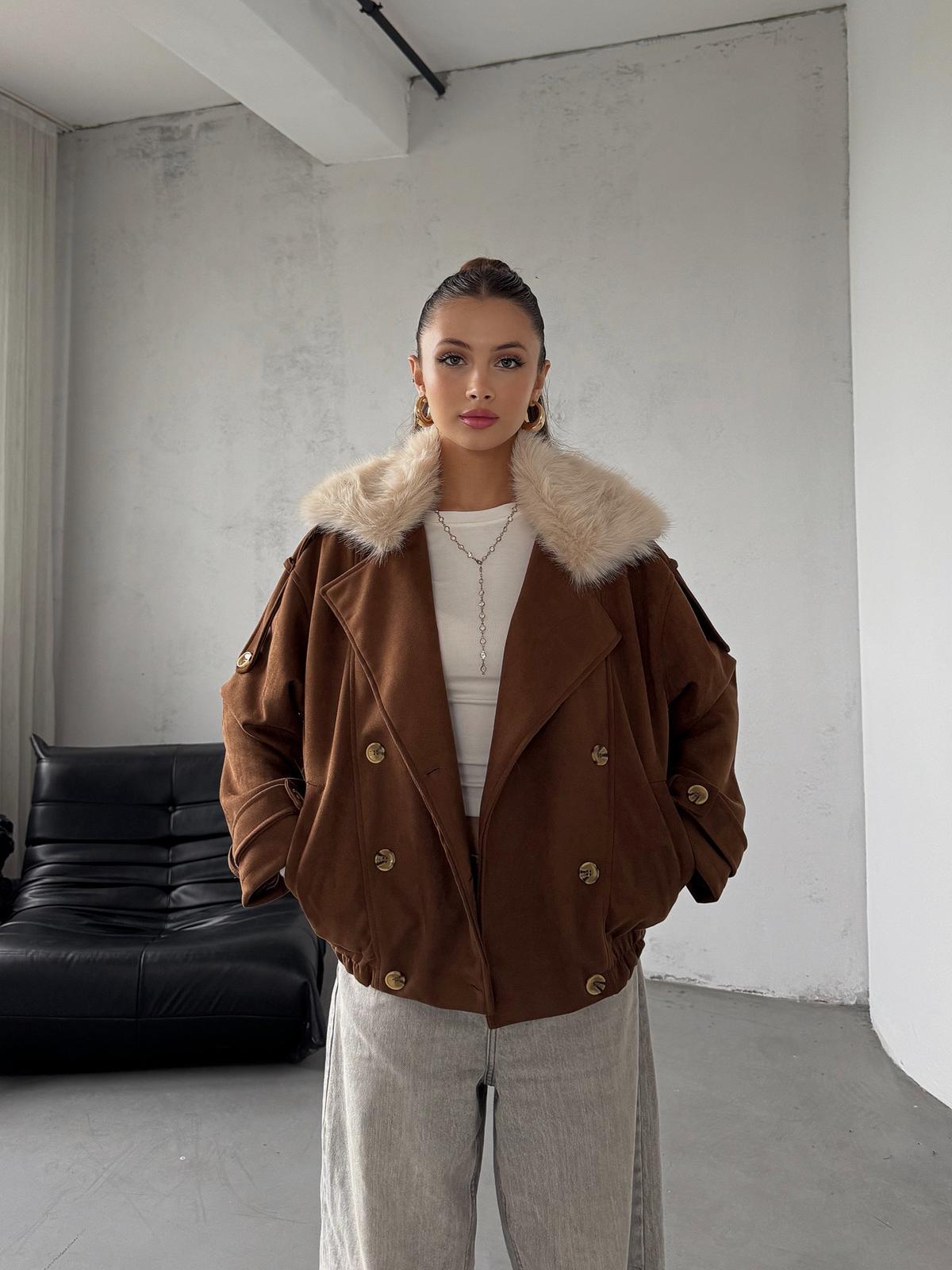 Drezin Yakası Kürk Detay Kısa Camel Süet Ceket