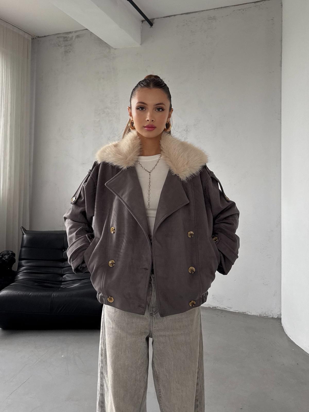 Drezin Yakası Kürk Detay Kısa Gri Süet Ceket