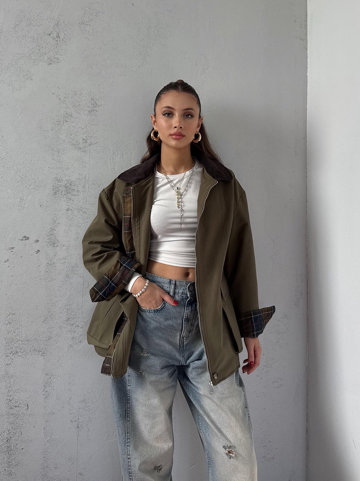 Elvar Yakası Kadife Detay Ekose Astarlı Haki Ceket