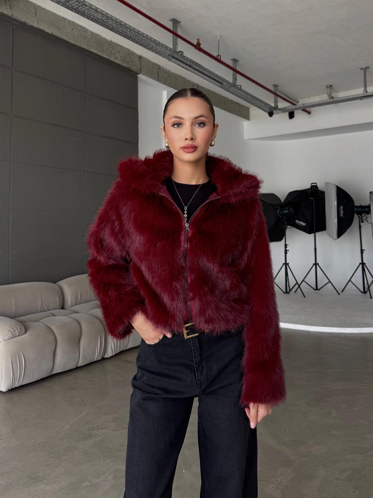 Elyora Dik Yaka Fermuar Detay Bordo Kürk Ceket