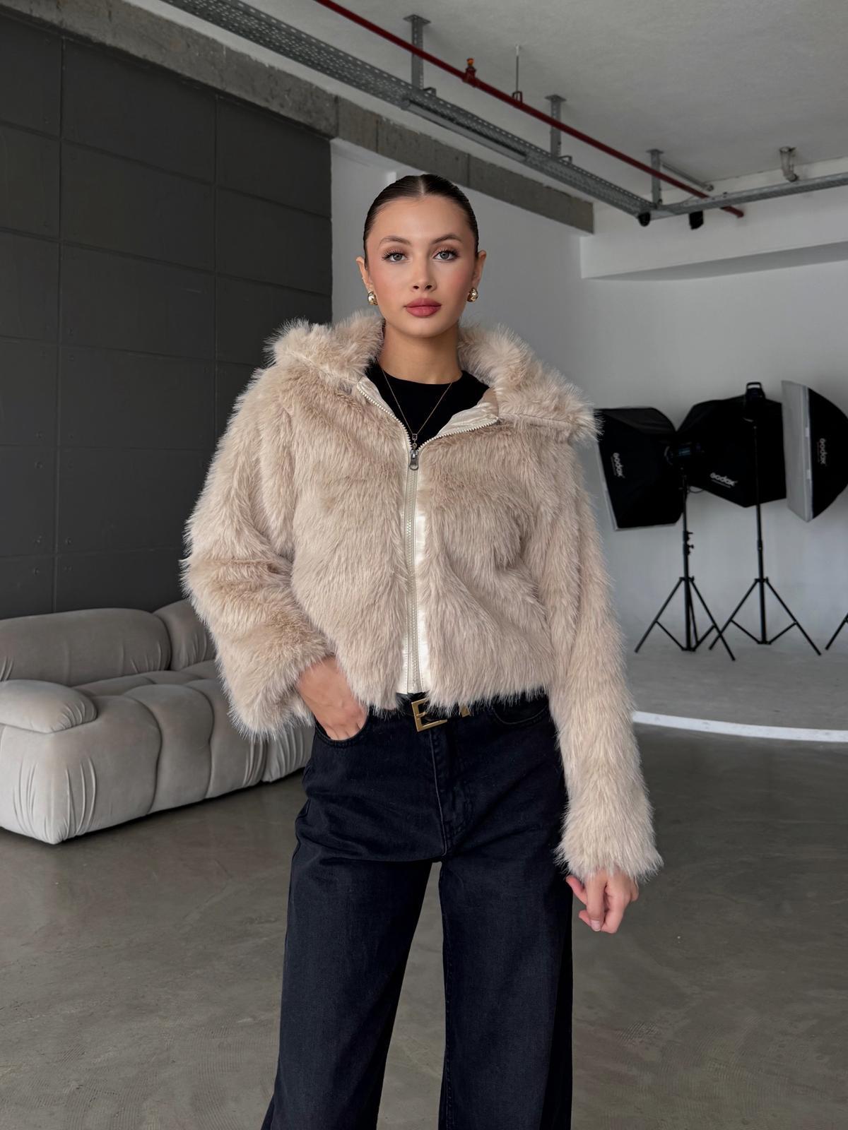 Elyora Dik Yaka Fermuar Detay Ekru Kürk Ceket
