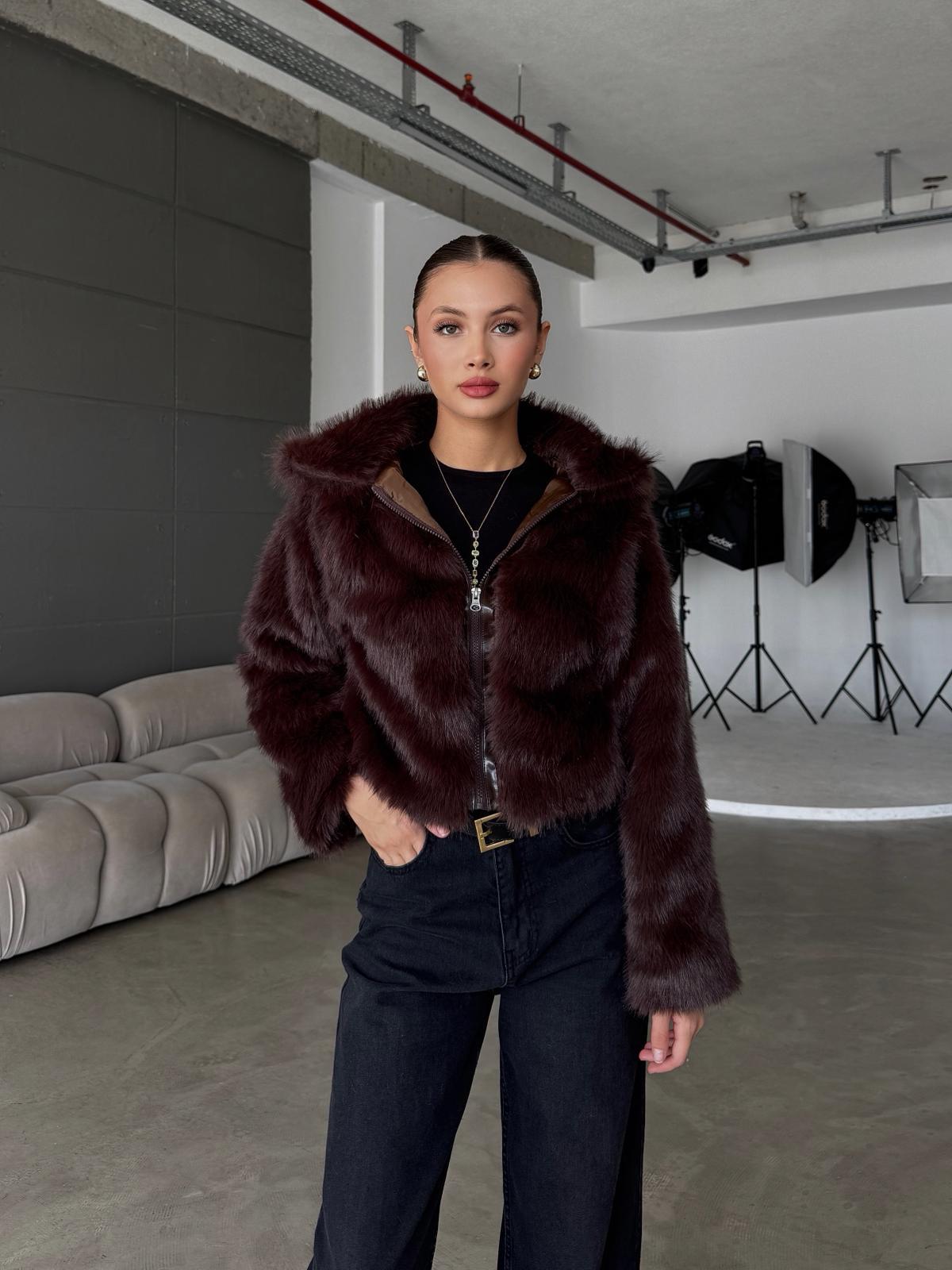 Elyora Dik Yaka Fermuar Detay Kahve Kürk Ceket