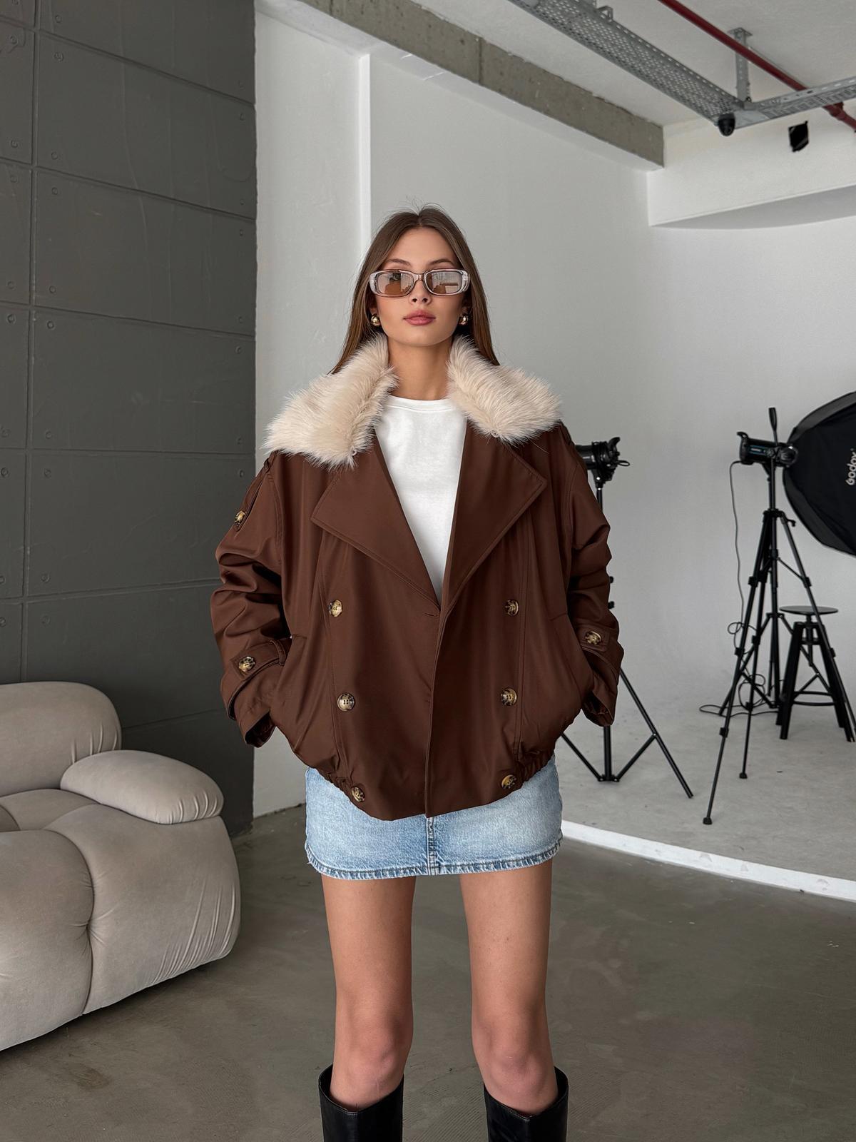 Jeksa Yakası Kürk Detay Kısa Kahve Trençkot