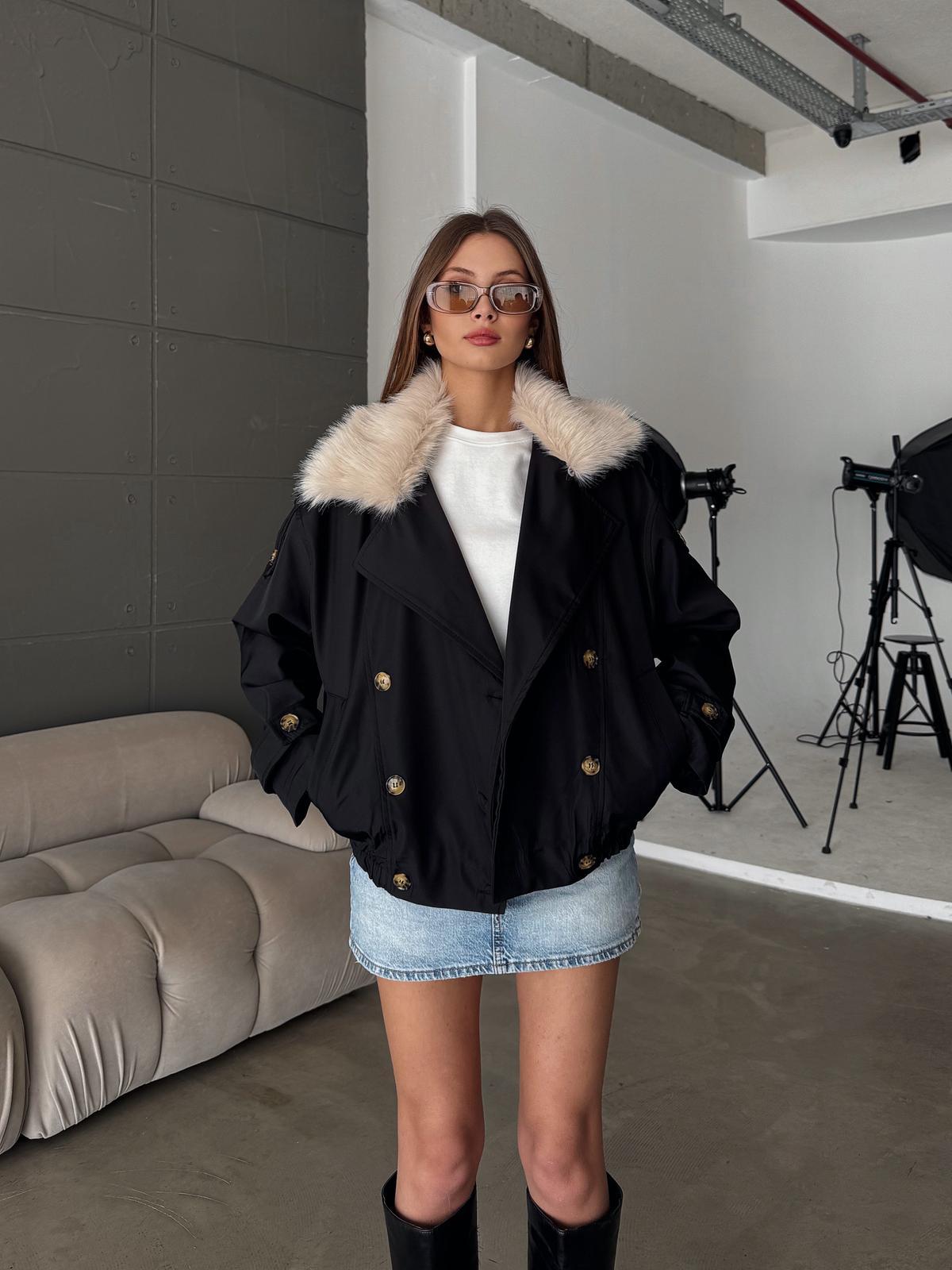 Jeksa Yakası Kürk Detay Kısa Siyah Trençkot