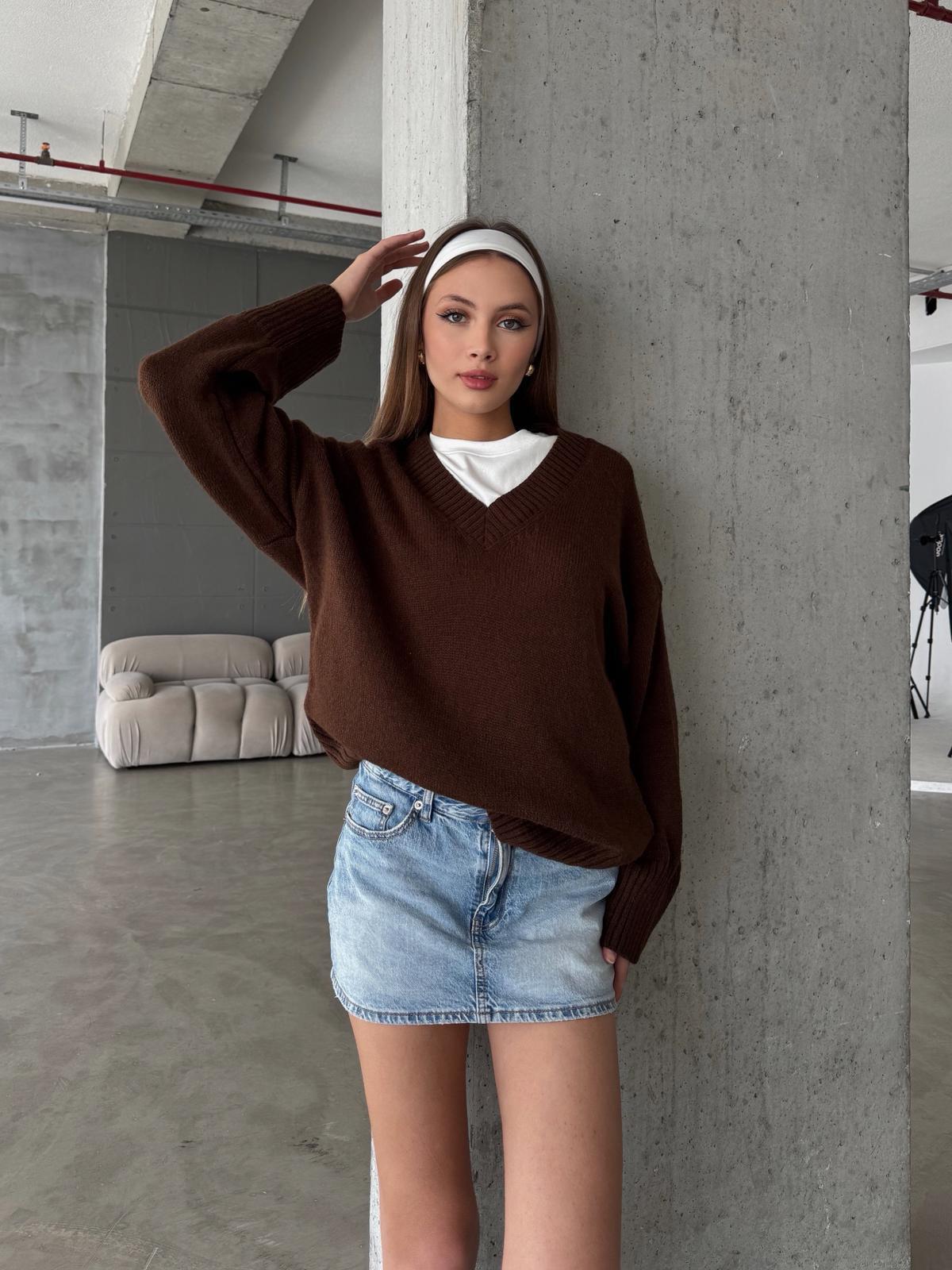 Kovia V Yaka Oversize Kahve Triko Kazak