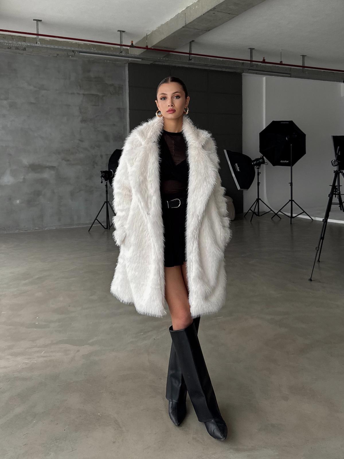 Lunafur Çıtçıt Detay Premium Beyaz Uzun Kürk Ceket