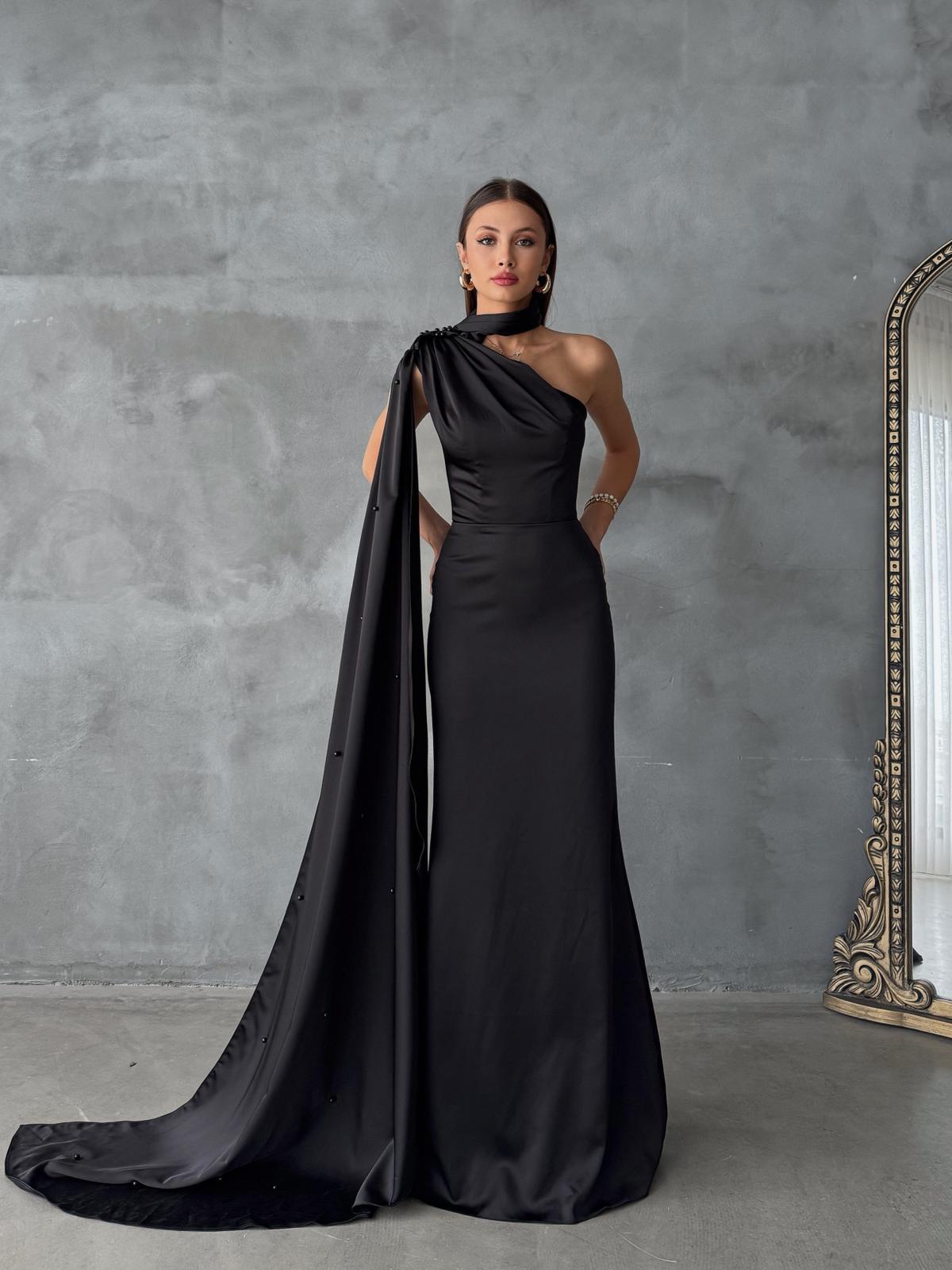 Lunexa Tek Omuz Şal Detay İncili Siyah Uzun Abiye