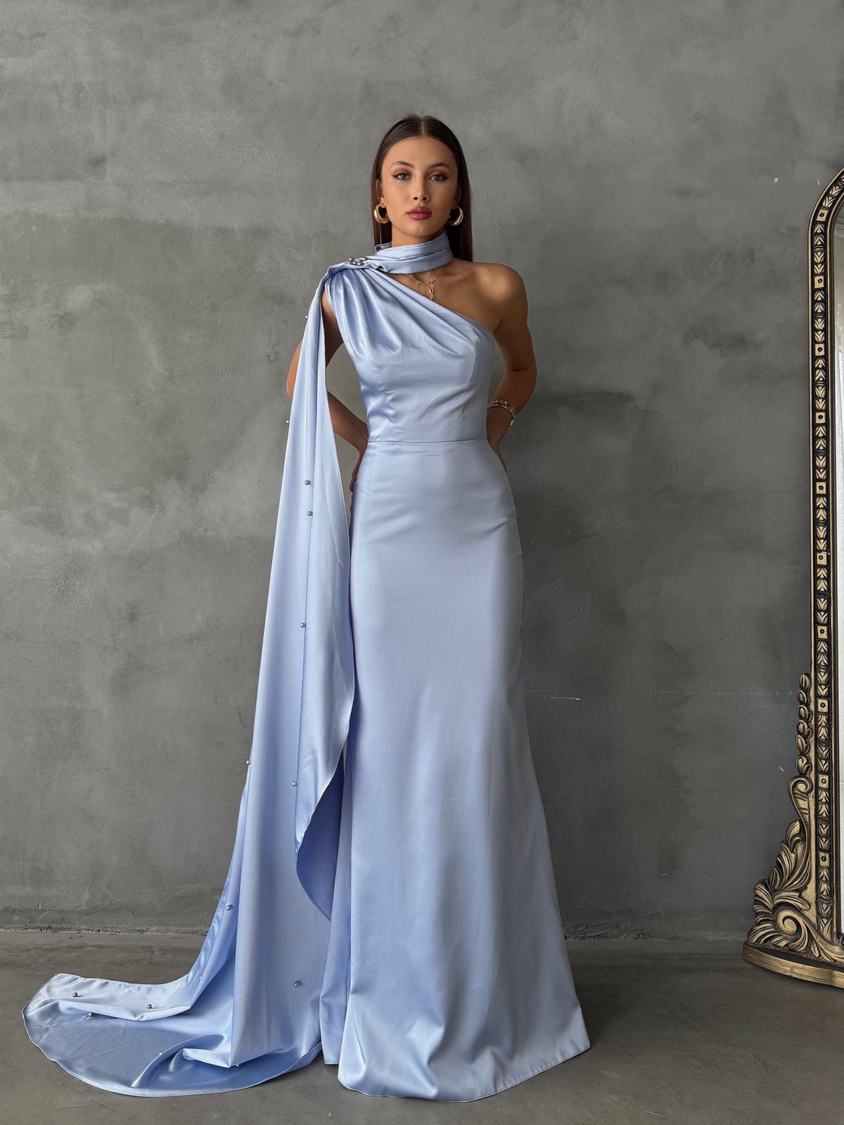 Lunexa Tek Omuz Şal Detay İncili Bebe Mavi Uzun Abiye