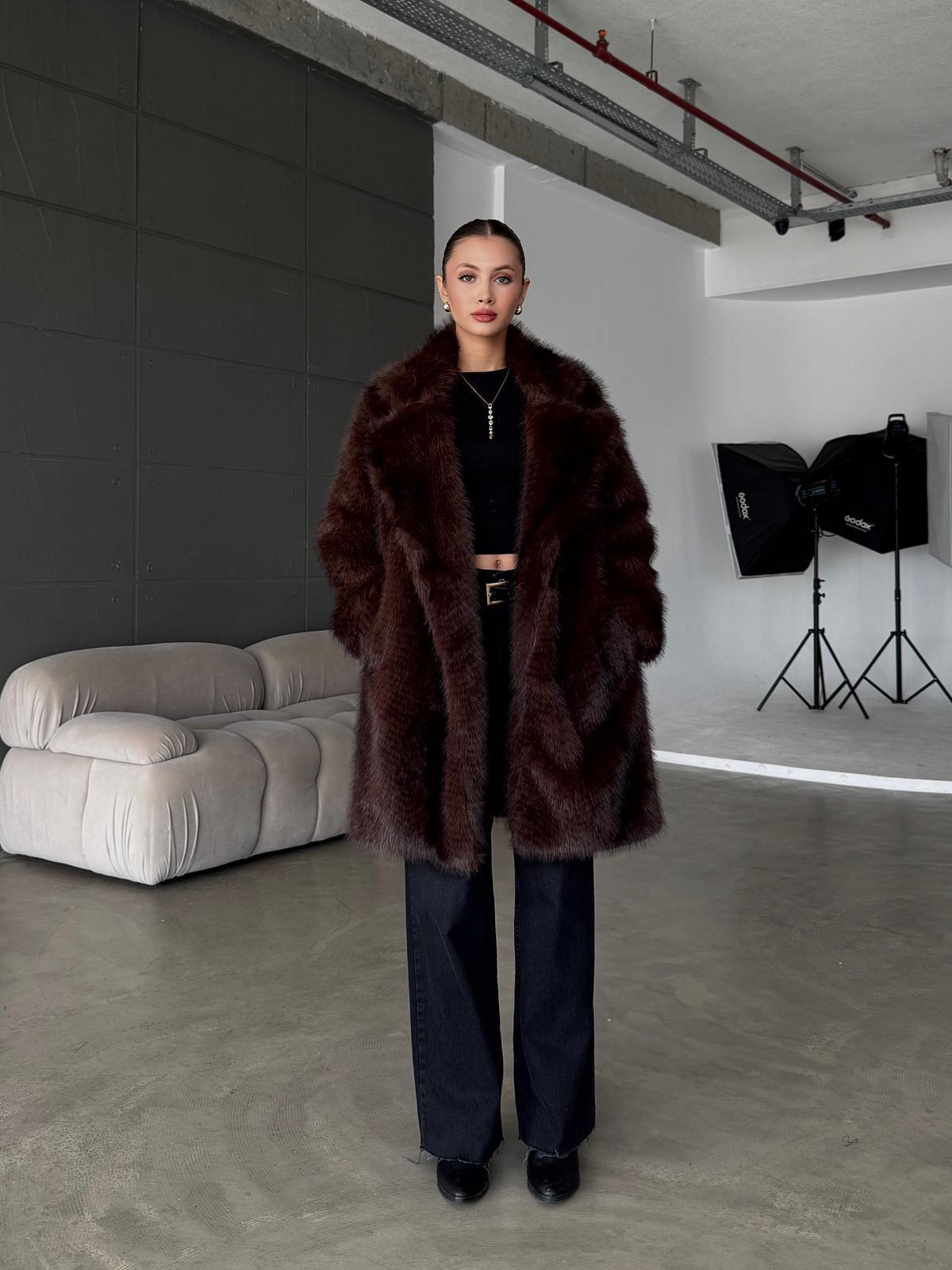 Morvai Çıtçıt Detay Jakarlı Premium Acı Kahve Uzun Kürk Ceket
