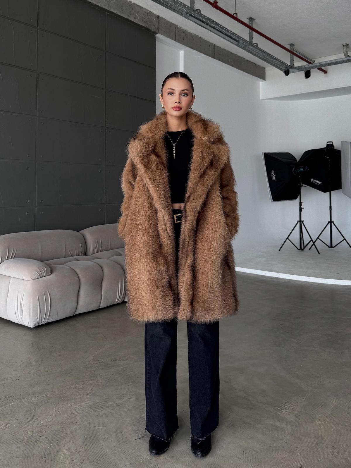 Morvai Çıtçıt Detay Jakarlı Premium Koyu Bej Uzun Kürk Ceket