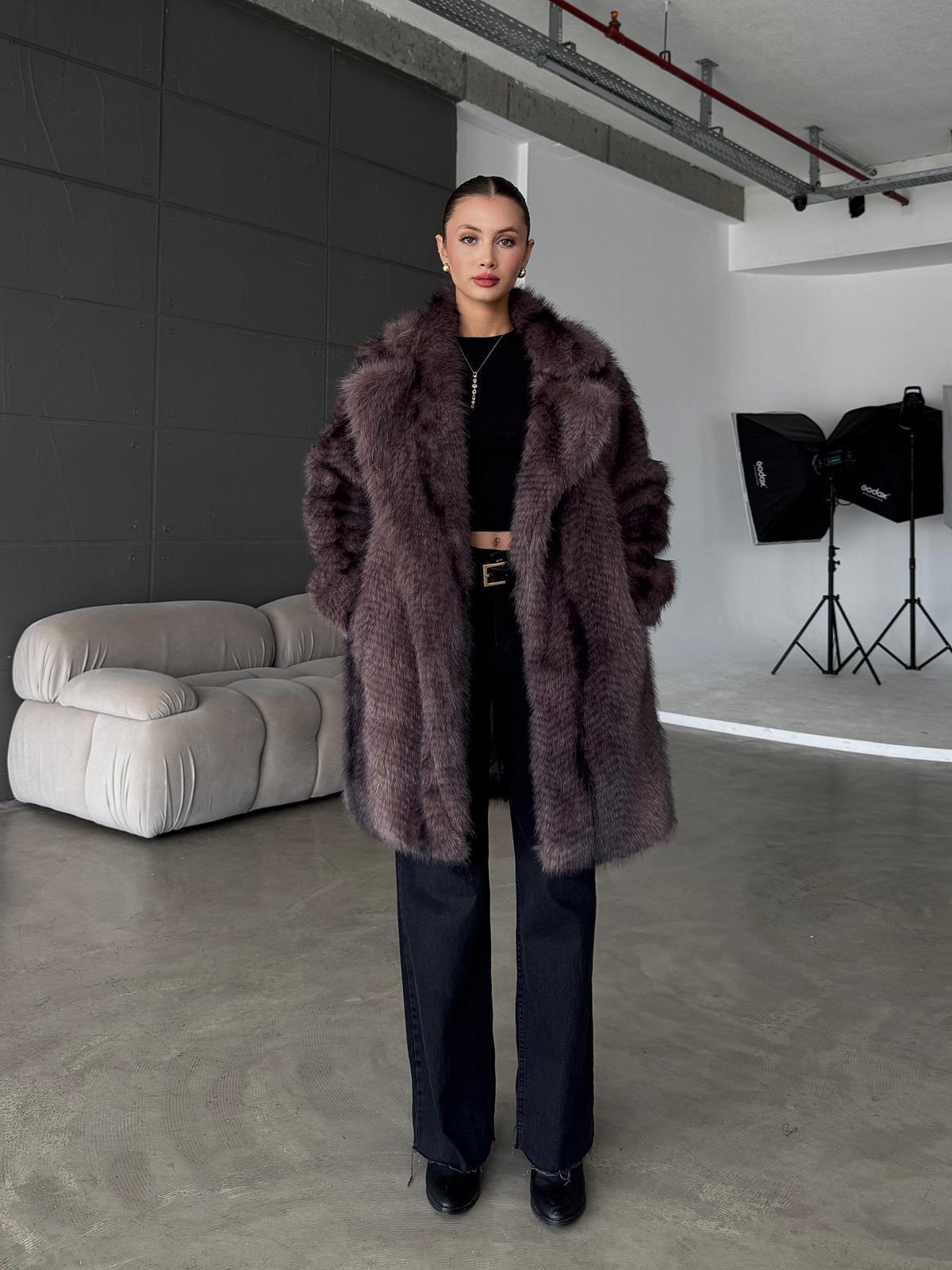 Morvai Çıtçıt Detay Jakarlı Premium Mürdüm Uzun Kürk Ceket
