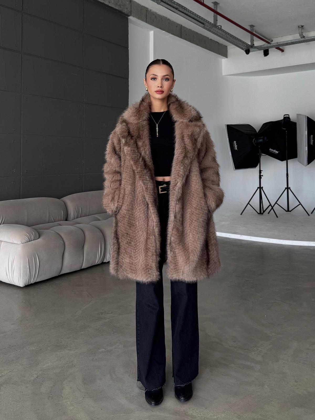 Morvai Çıtçıt Detay Jakarlı Premium Tatlı Kahve Uzun Kürk Ceket