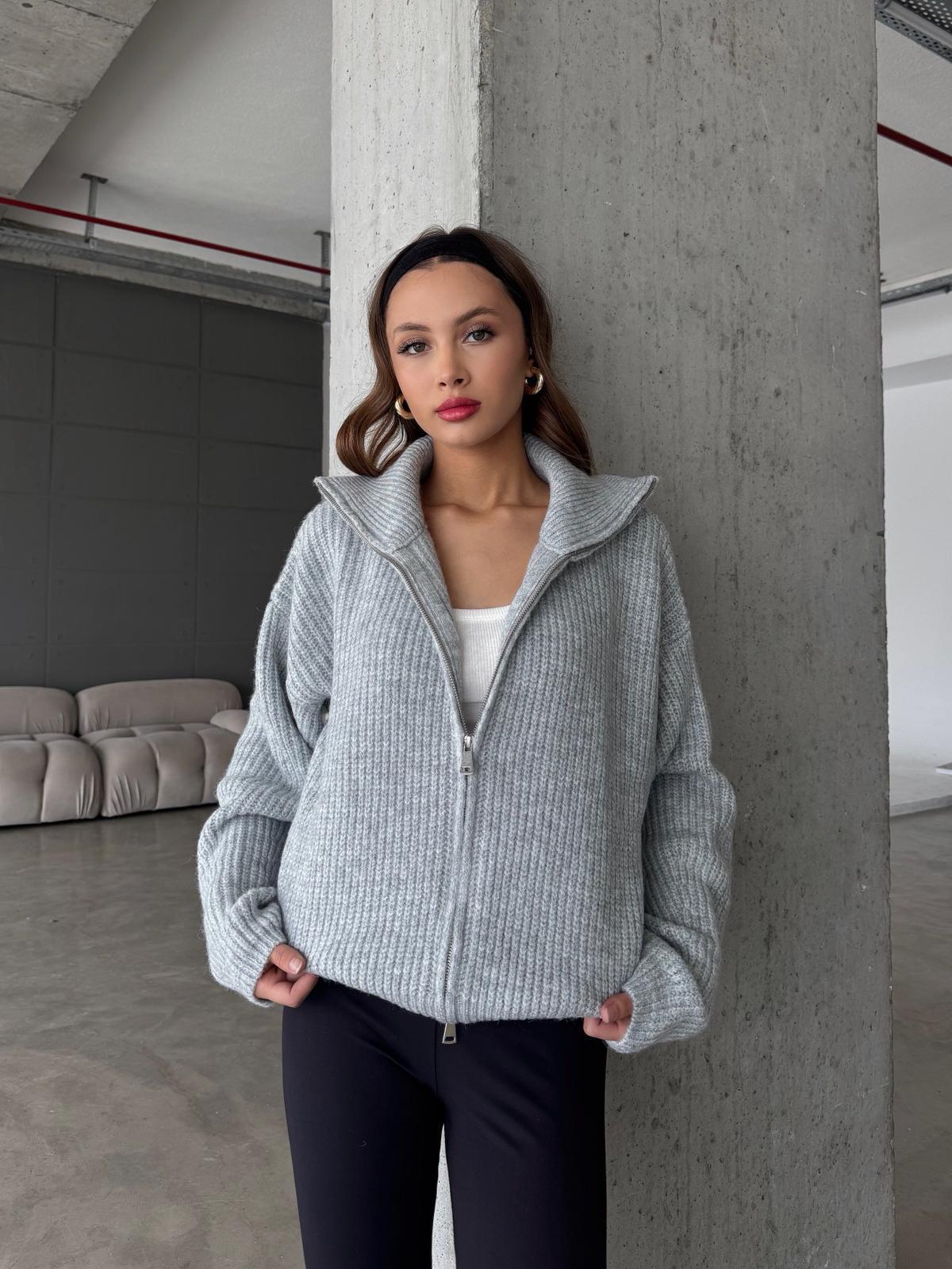 Nuvia Gri Çift Fermuarlı Triko Hırka