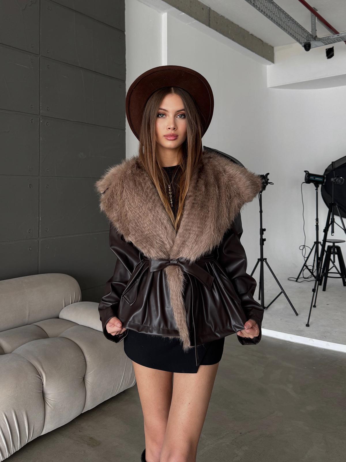 Ovrin Kahve Yakası Kürk Detay Bağlamalı Koyu Bej Ceket