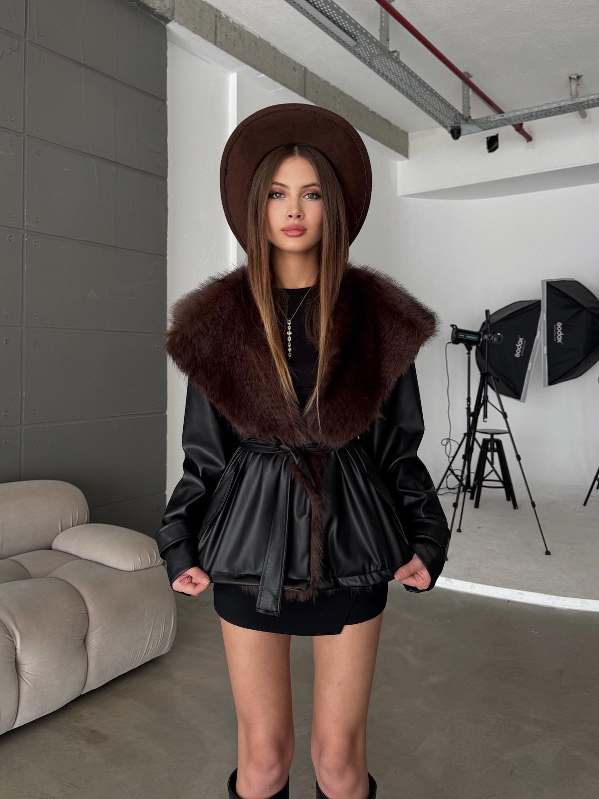 Ovrin Yakası Kürk Detay Bağlamalı Kakao Ceket