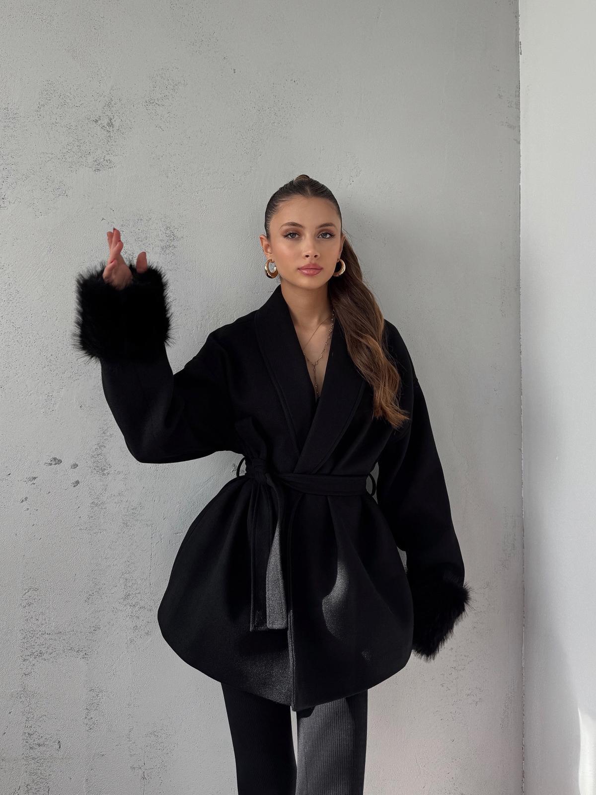 Tarenne Kolları Kürk Detay Bağlamalı Siyah Kaşe Kimono