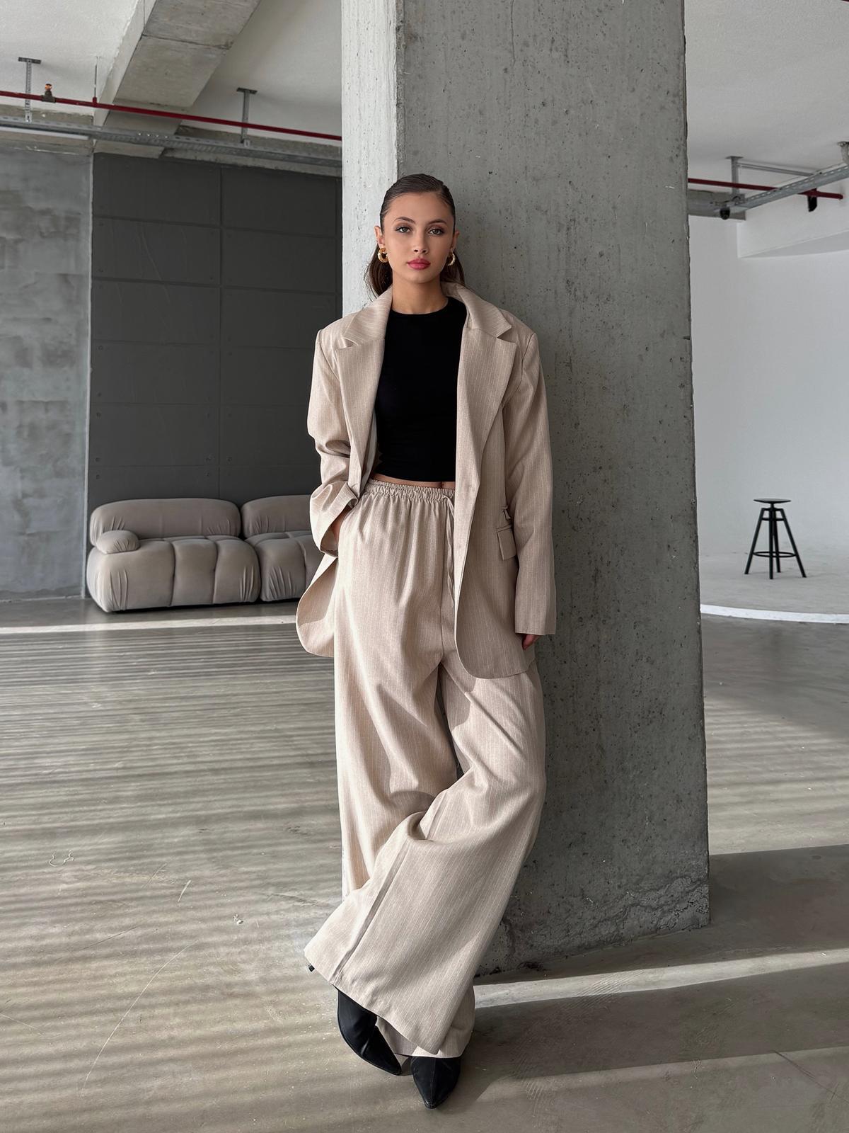 Ulvenor Bej Çizgili Düğme Detay Cepli Blazer Takım